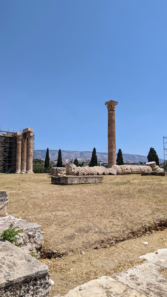 C’est grand ! Les photos ne rendent pas la grandeur de ce temple de Zeus commencé 515 av. J.-C. puis abandonné et achevé sous Hadrien en 131 apr. J.-C.. Il comptait 400 colonnes corinthiennes de marbre pentélique, chacune haute de 17 m et de 2,6 m de diamètre.