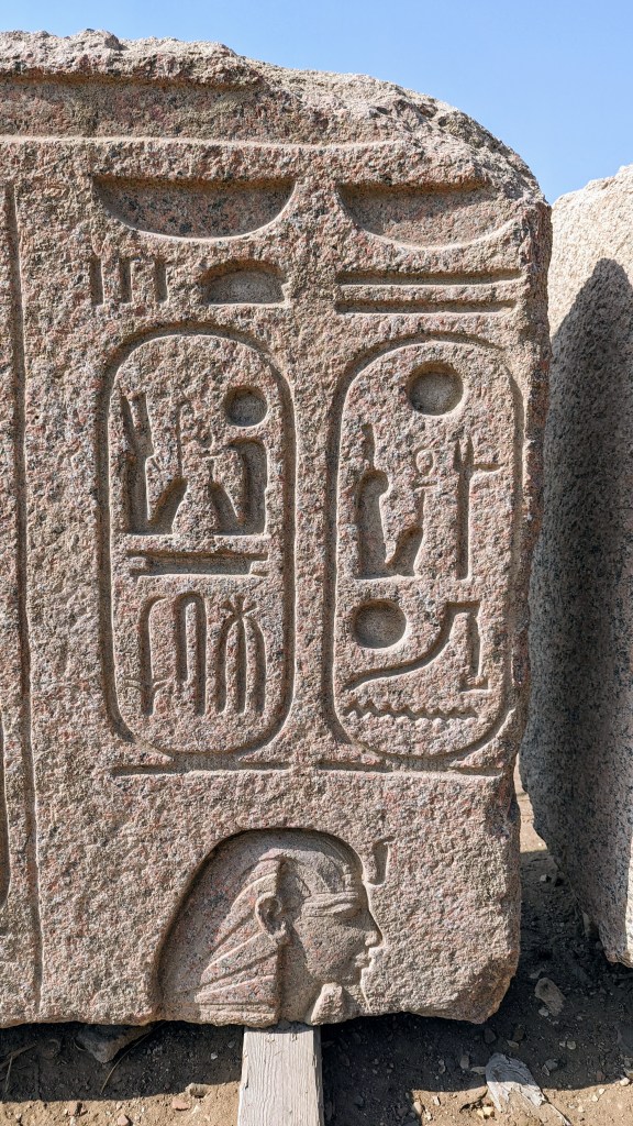 Le site de Memphis est petit, il est possible de le faire en 20 minutes. Il se situe à côté des pyramides de Saqqarah et Dahchour. Son réel intérêt est son sphynx et surtout sa statue colossale de Ramsès II mesurant 10m sans ses jambes. Les cartouches égyptiennes permettaient lorsque l’on passait dans l’au-delà de retrouver son nom. Ici, j’ai pris en photo les 2 cartouches de Ramsès II.