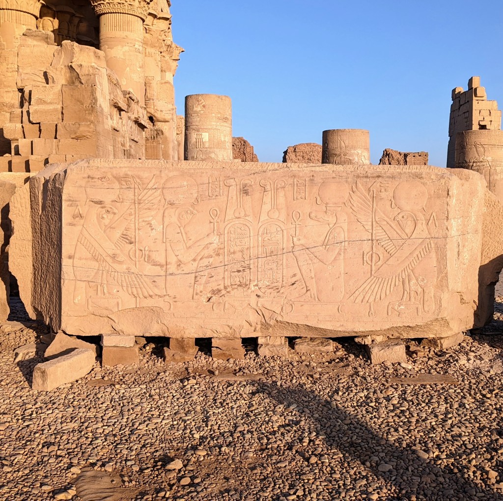Il est unique et c’est ce que j’ai aimé en voyant ce temple, bien qu’il ne soit pas le plus grandiose. Il y avait moins de monde ce qui rend la visite également plus agréable. Il est unique car il possède deux entrées pour adorer deux dieux ; Horus face à Sobek. Il n’est pas en connexion directe avec un autre temple. Ses dessins sont en bel état et expliquent notamment le calendrier égyptien et les outils utilisés par les « chirurgiens » antiques. J’ai aimé également le petit musée de crocodiles à côté où j’ai pu les apercevoir momifiés.