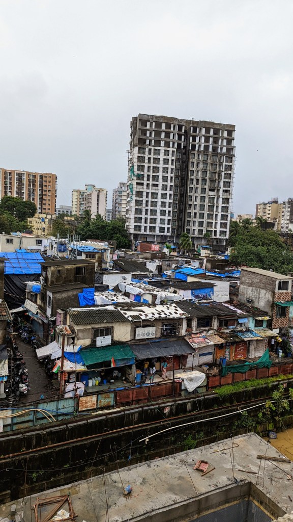 J’aimerais dire que j’ai été ébloui en sortant de l’avion. Mais, la réalité est tout autre ! Il pleut et la première image que j’ai en sortant de l’aéroport de Bombay, est ces maisons construites en tôles avec une simple bâche comme toit. Il y avait plusieurs petites cités comme celle-là à la sortie.