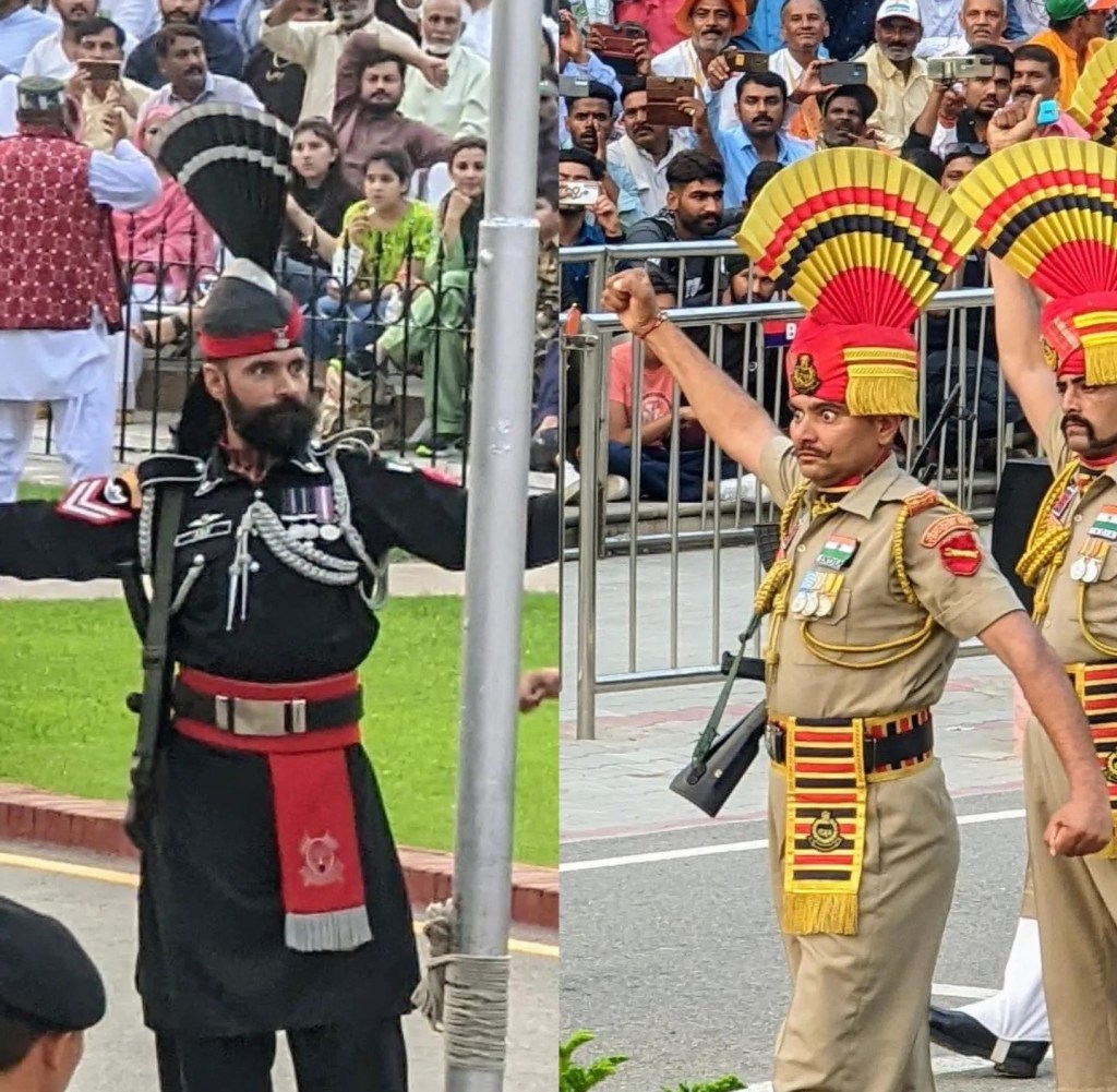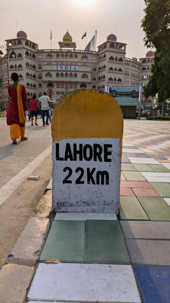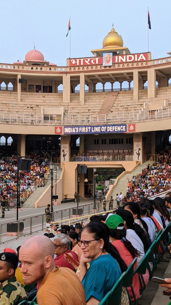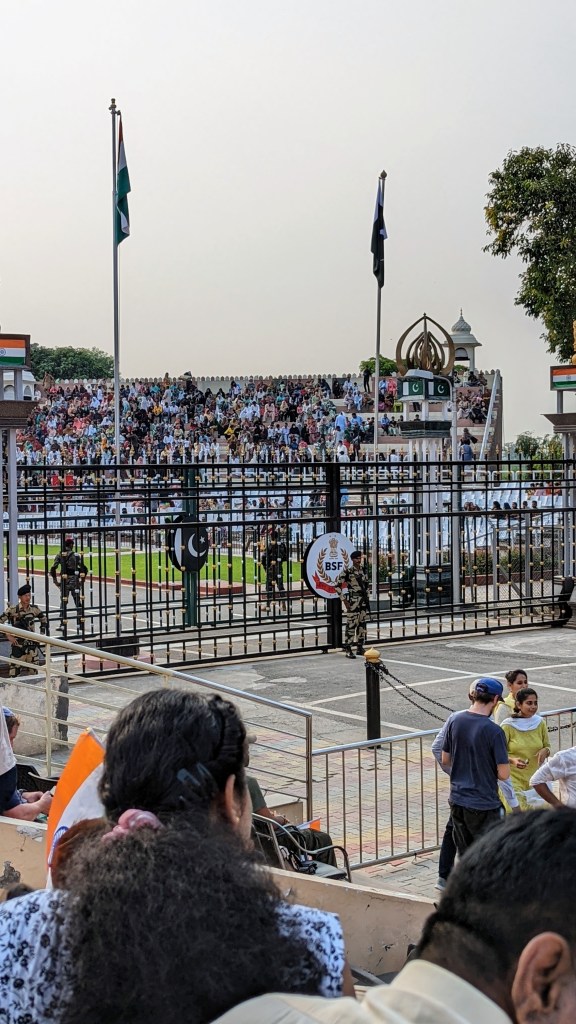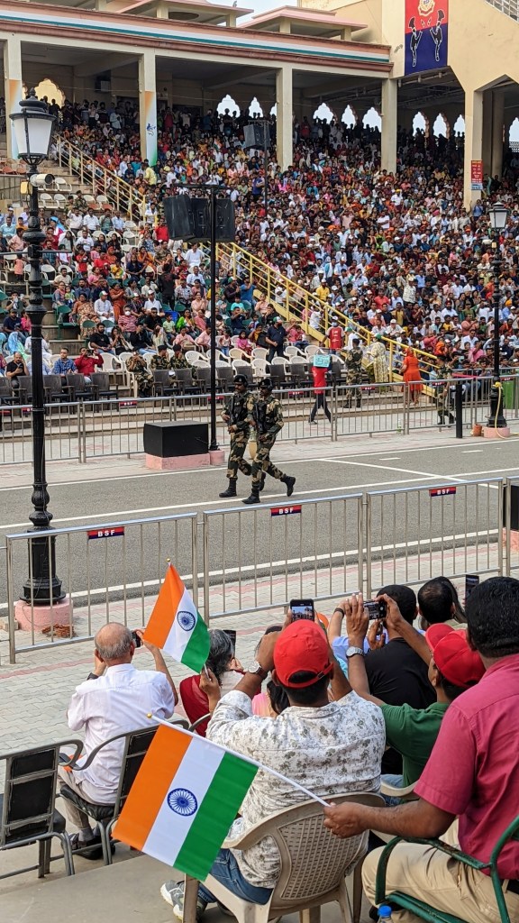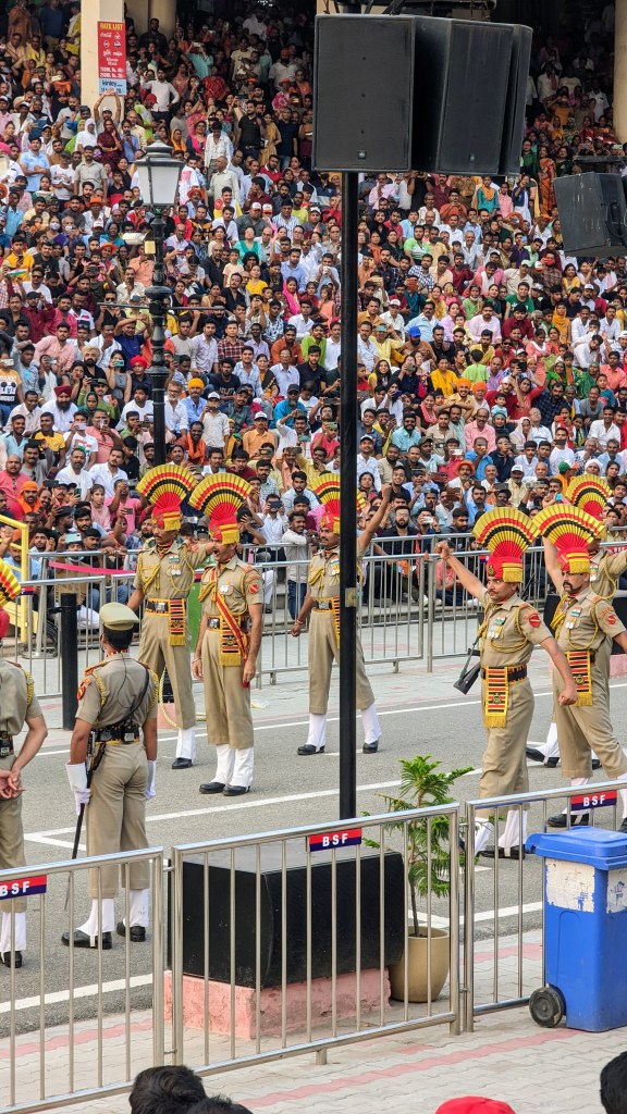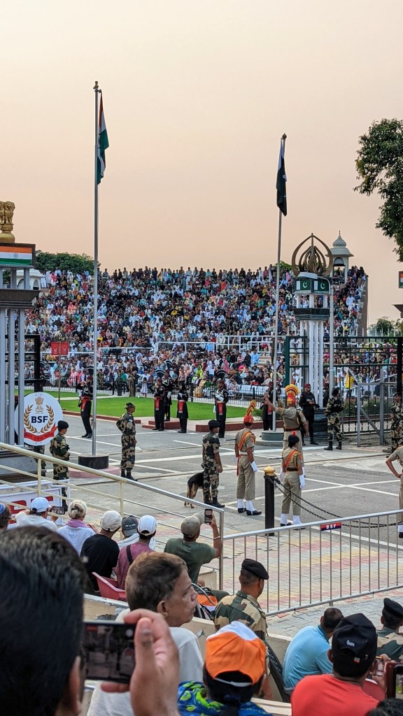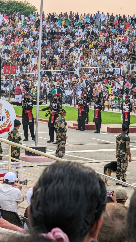 Situé à 40 kms d’Amritsar et à 22 kms de Lahore se trouve l’unique poste frontière terrestre entre l’Inde et le Pakistan. La frontière est longue de 2912 kms de barbelés et de spots lumineux pour vérifier qu’il n’y ait aucun passage (c’est d’ailleurs l’une des seules frontières visibles dans l’espace). La situation entre les deux pays est très tendue depuis de nombreuses années concernant le territoire. Tous les soirs, la frontière est fermée par une cérémonie spectaculaire digne d’un spectacle de Bollywood. Le baisser de drapeaux est précédé par un spectacle où les deux parties tentent d’impressionner l’autre camp par des marches, des regards, des cris de militaires ou des cris d’un public chauffé à bloc par un militaire devenu chauffeur de salle.