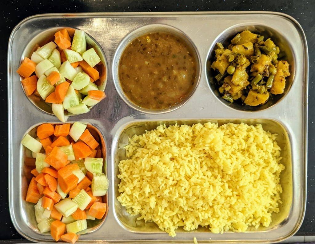 Petit focus sur la nourriture… Dans ce genre d’écoles, on fournit de la nourriture pour les yogis… Elle n’est pas très variée mais tous les jours, j’ai mangé correctement. J’ai su apprécier au fur et à mesure cette nourriture avec du poha, du chai, du riz, des chapatis, du prasad avec des légumes et des fruits.