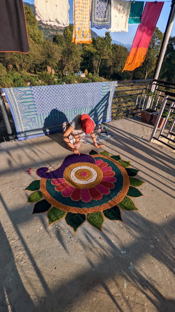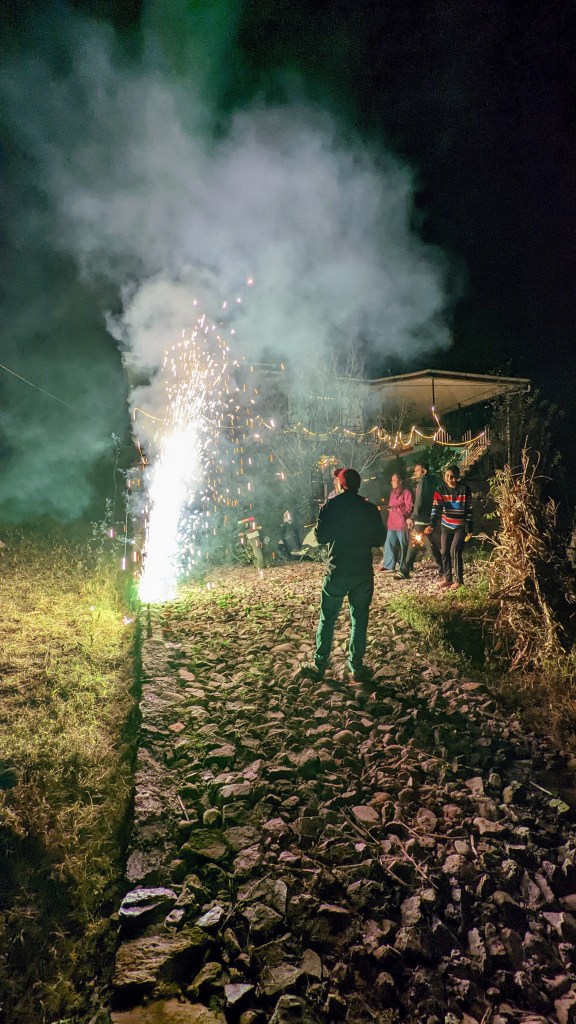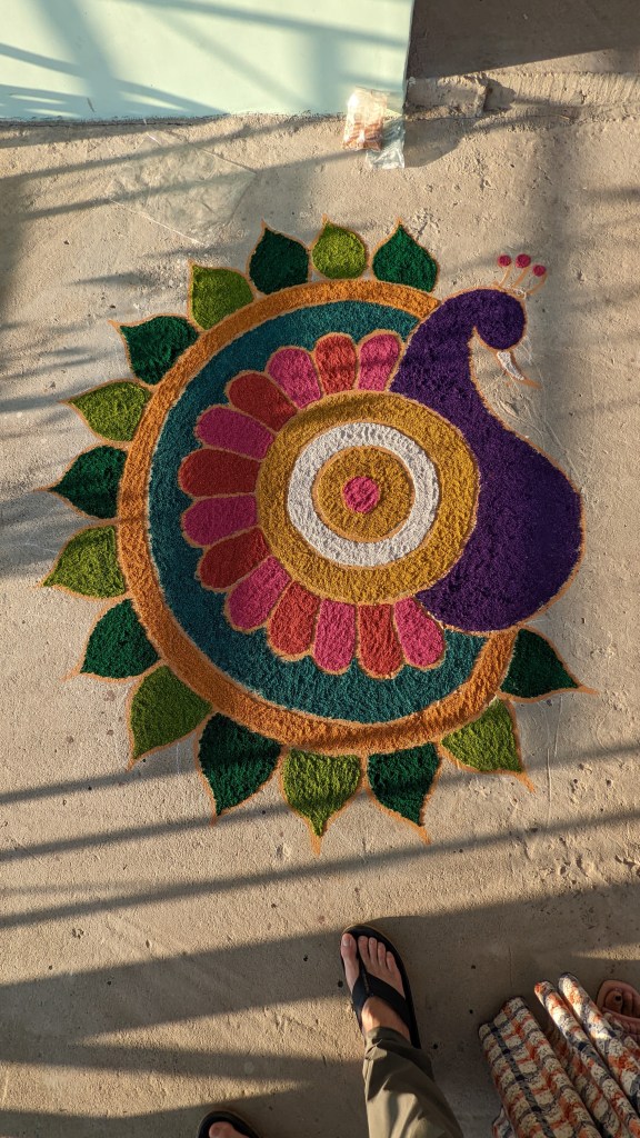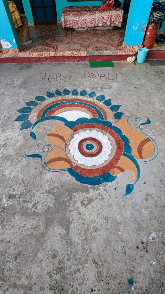 La préparation d’événements se fait en famille. J’ai eu la chance de participer à la célébration du Divaldi… La préparation a consisté à la cueillette des fleurs dans le jardin, le nettoyage de la maison, la création de colliers de fleurs, la décoration de la maison avec les fleurs et des lumières, la réalisation de peinture sur le sol et de rangolis. Ensuite, la fête se réalise en mangeant des gâteaux et des plats spécialement préparés pour l’occasion. Le soir et toute la nuit, le village est baigné par le son des pétards que tout le monde lance. HAPPY DIVALDI !