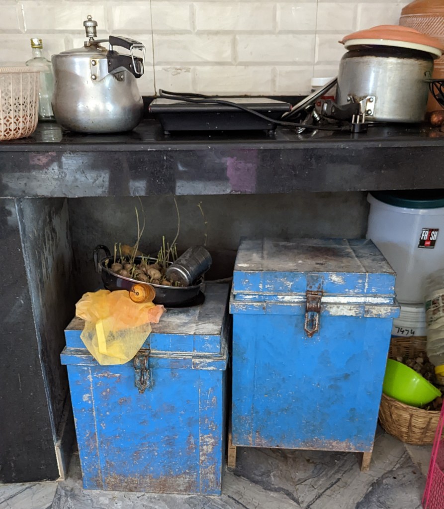 2 males sous l’évier : une remplie de farine, l’autre remplie de riz